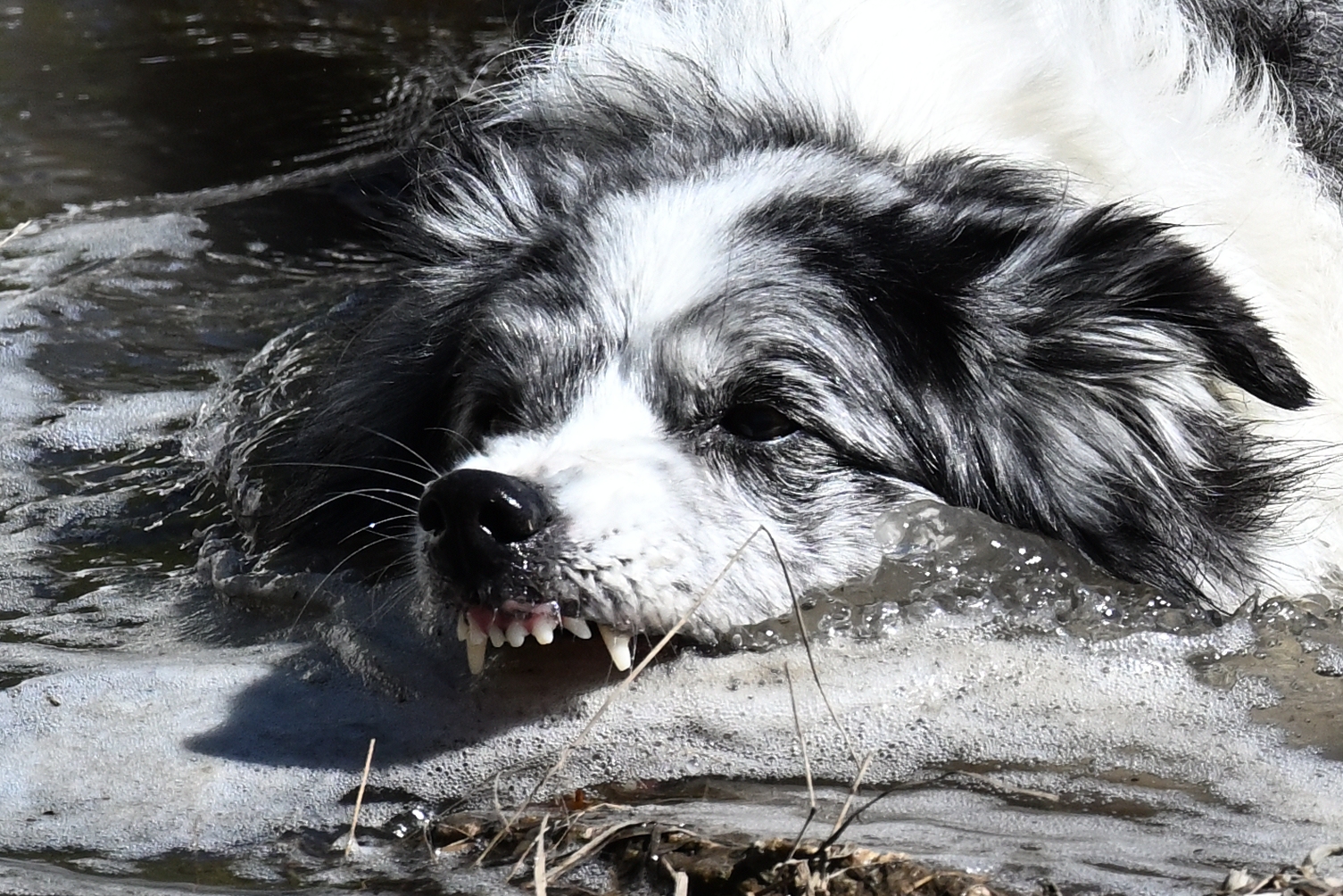 Links: Workingpaws Aluna "beisst" in aufgeschäumtes Eiswasser eines Bergsees