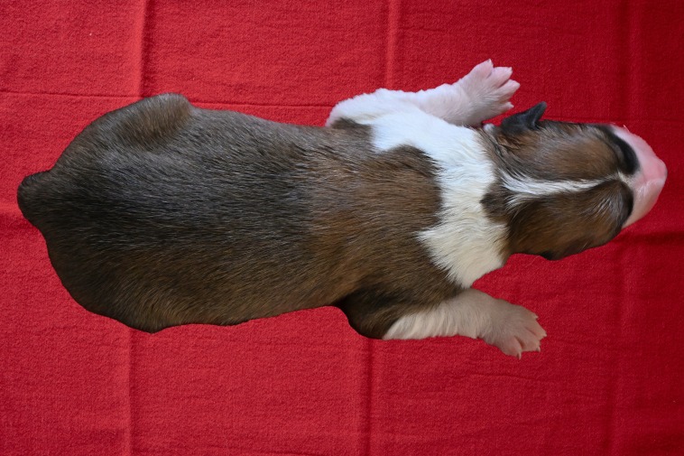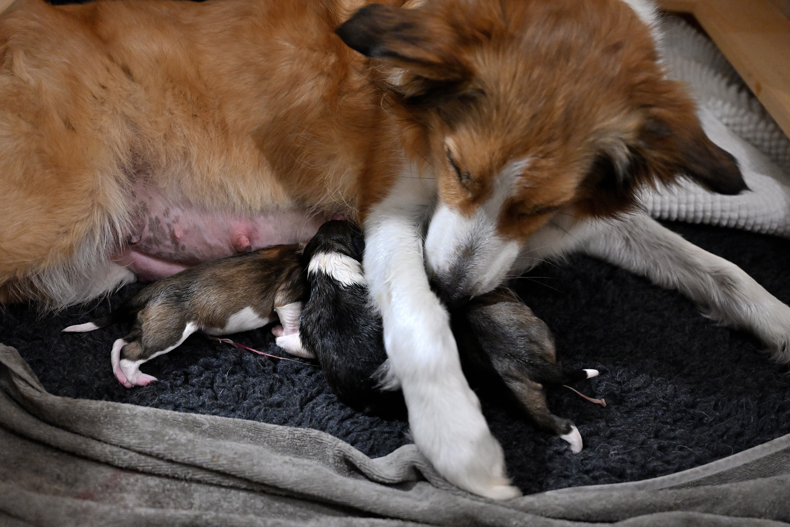 Nach längeren heftigen Wehen kommt um 18:40h der erste Welpe und ca. 23:50 der letzte der 6 Welpen gesund und munter zur Welt.