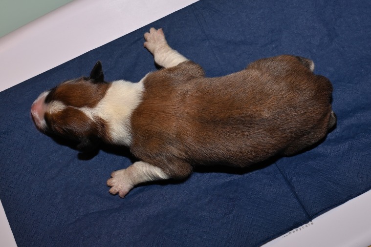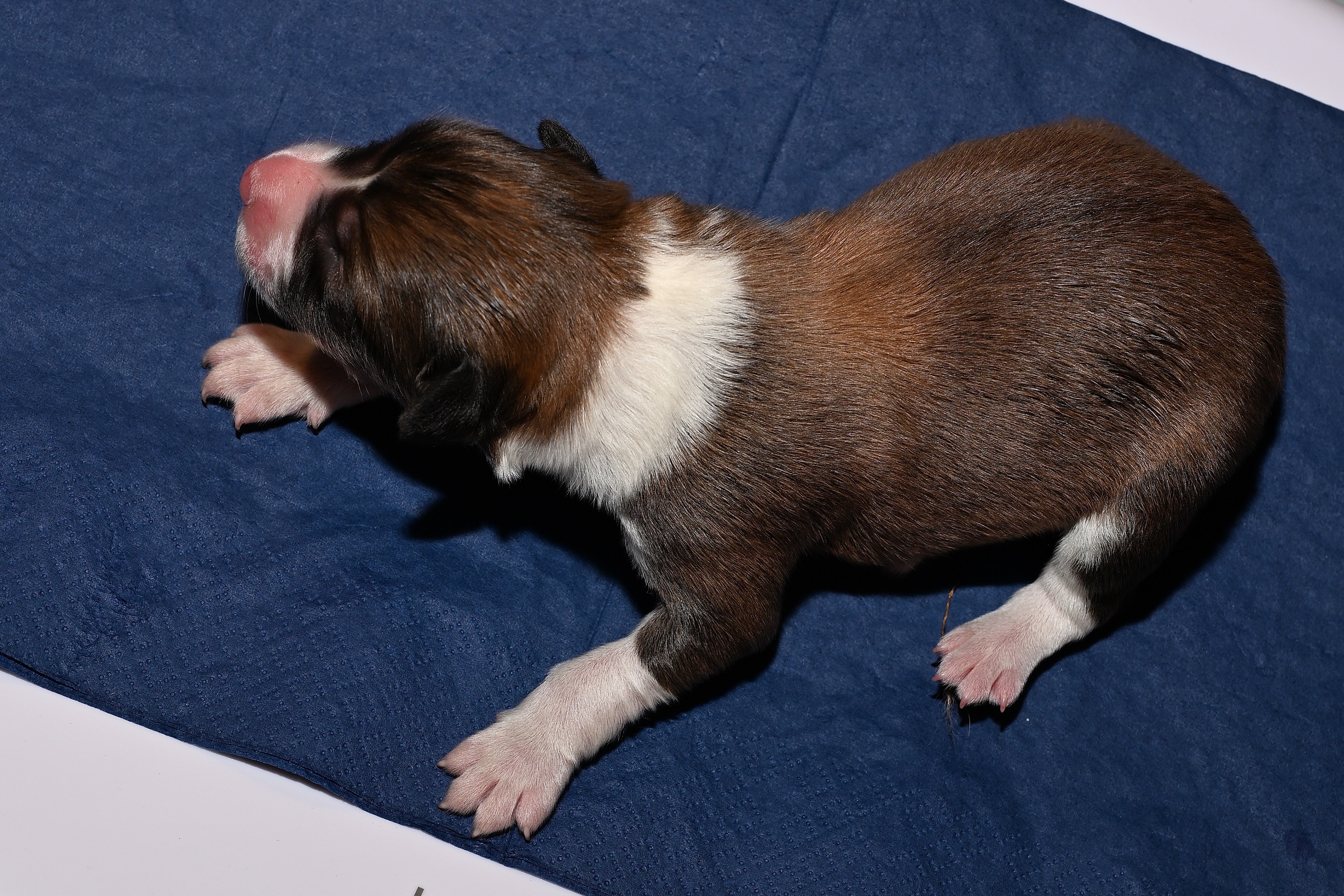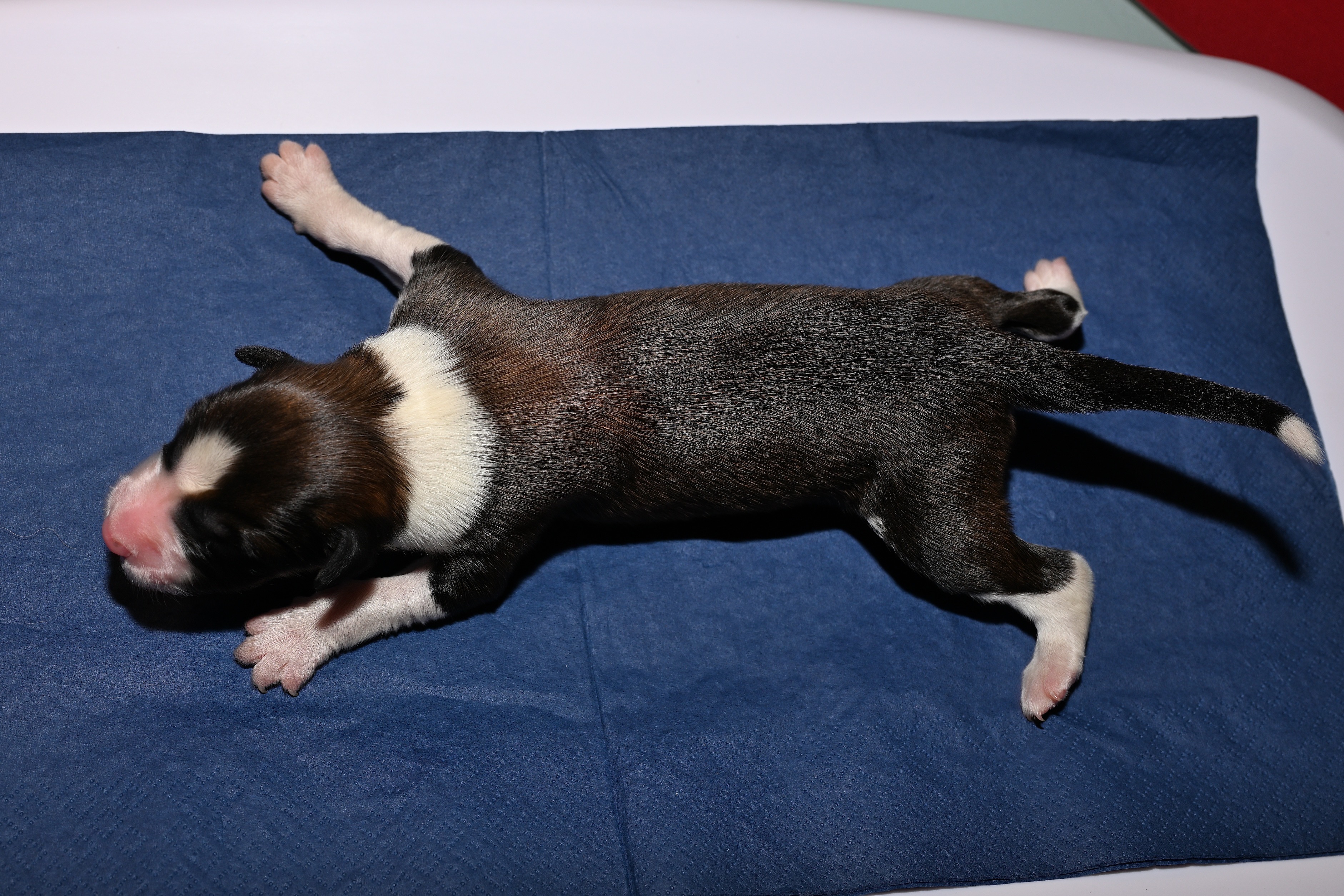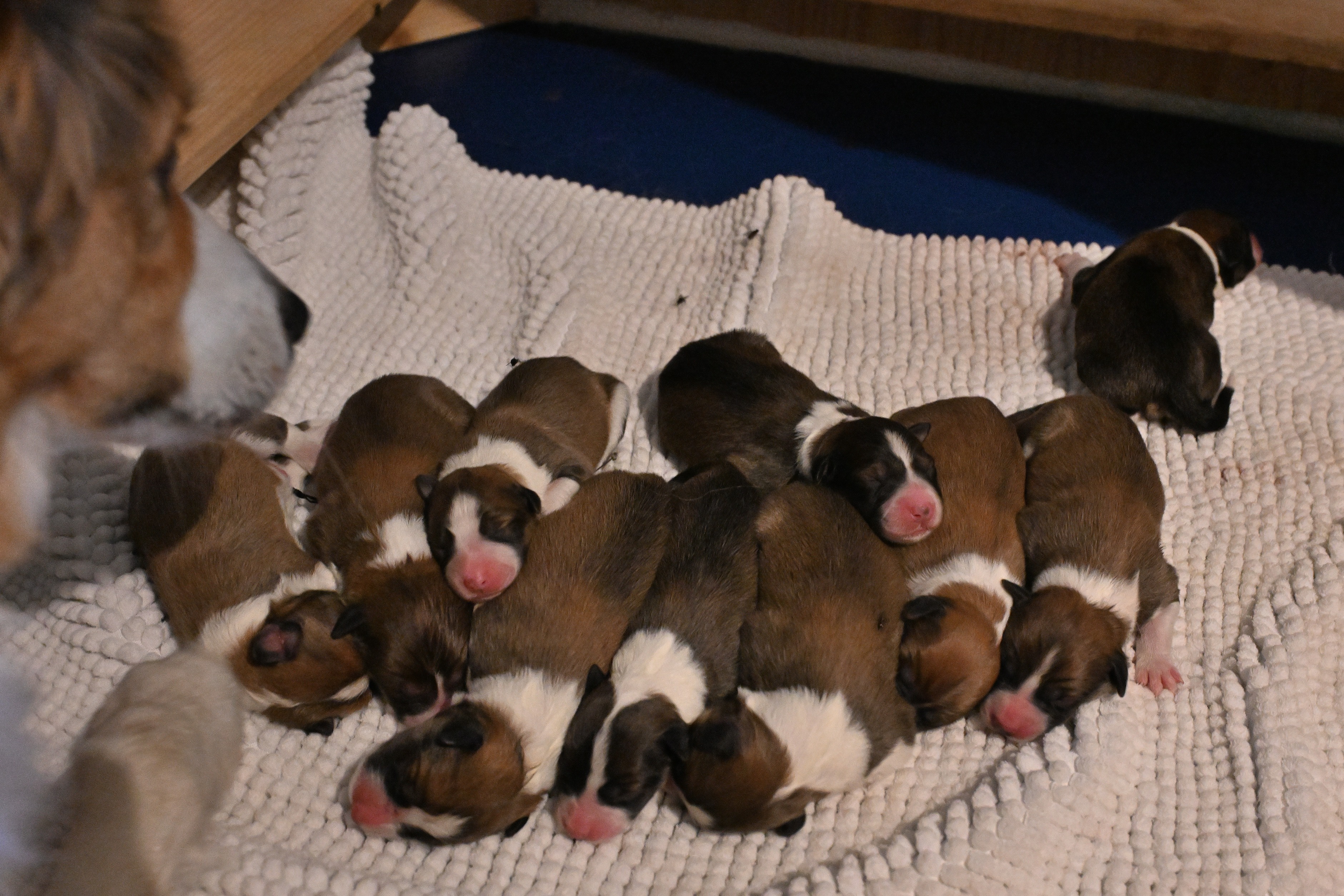 Der F- Wurf kommt dieses Mal am Tag zur Welt. Die Geburt ist zwar für Caitlyn recht lang, aber unkompliziert. Kurz nach 12 Uhr kommt der erste Welpe, um 22:30h dann der 10. und Letzte.